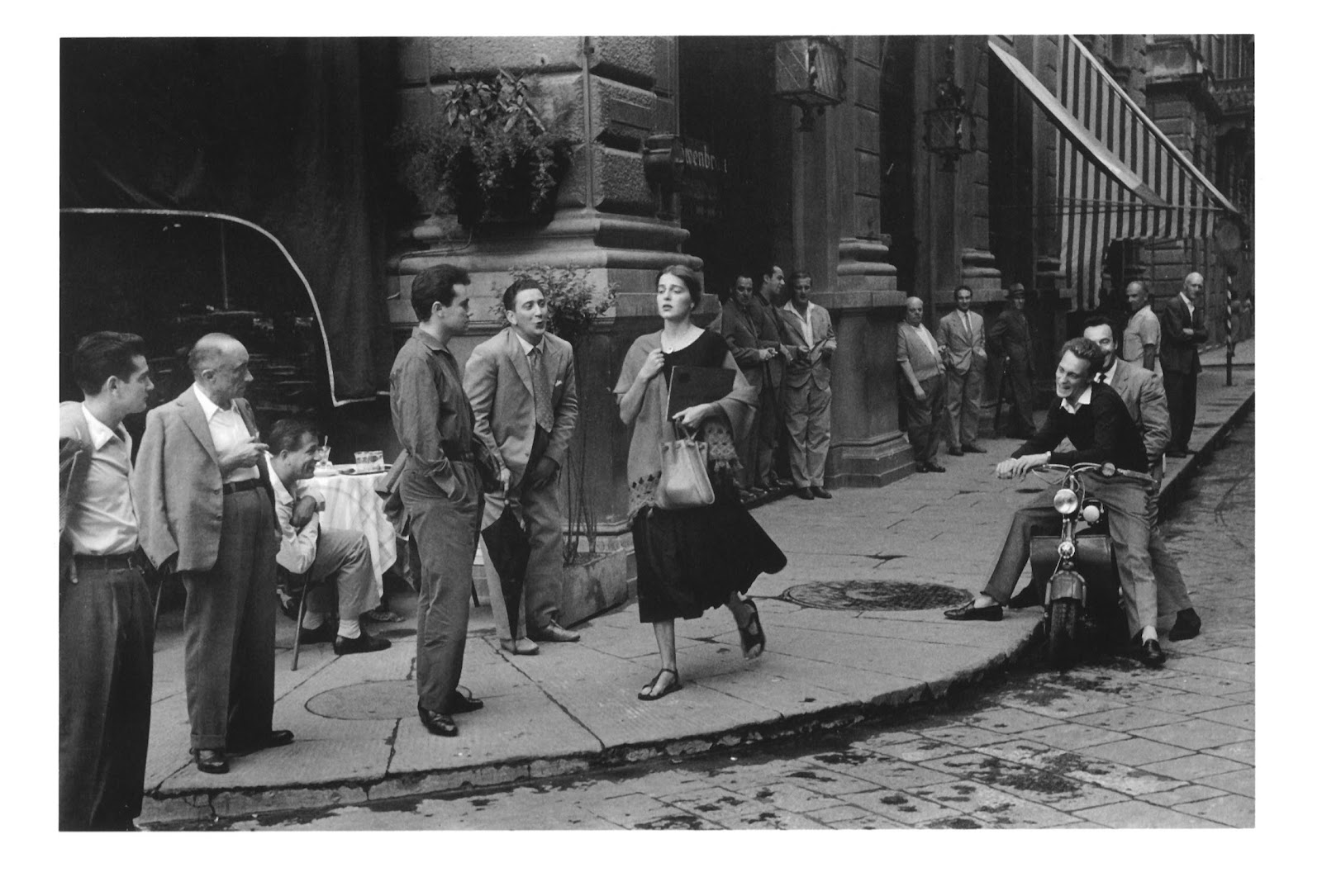 شهری است باران خورده که یک روز تعطیل را نشان می دهد یا محله ای که در آن ازدحام انسانی زیاد است. پیاده رویی را در شهر می بینیم که معماری آن متکی بر بافت های مستطیلی منتسب به دهه 50 ایتالیا است و متعلق به پایین شهر . پیاده رو به راحتی امر پرسه زنی مردانه را توجیح می کند. مردان مشغول برانداز کردن زنی هستند که پوشش آن متفاوت است. عمق صحنه تاریک و جلو روشن است، خطوط عمودی بسیار در انتهای عکس و خطوط مورب و دایره ای در جلوی عکس دیده می شود. زن کتابی در دست دارد و با لباسی نه چندان گرم و سندل مشغول عبور از پیاده رو است. سرش بالاست و آرام و مطمئن قدم بر می دارد.